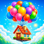 Your goal is to help the house, floating in the sky on a variety of colorful balloons of different shapes, to land on the ground. Clicking on the balls, you move them to the cells at the bottom of the screen. Collect three identical ball objects in a row to make them disappear, freeing up space and bringing the house closer to the ground. Grandpa is sitting on the roof, and when the house finally lands, he will be happy to celebrate the victory!