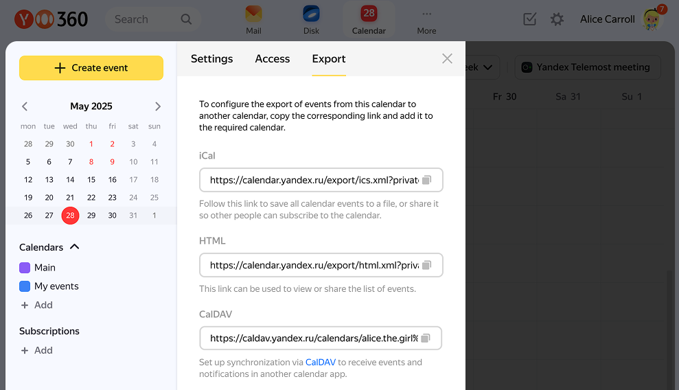 You can export events from Yandex Calendar and import them to a calendar embedded on another website or share events from your calendar with others by sending them a file or a link.
