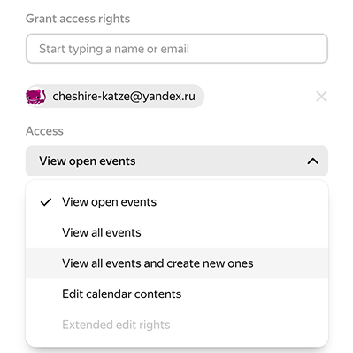 In the Access section, start typing the name or email address in the Grant access rights field and Yandex Calendar will show suggestions from your contacts.