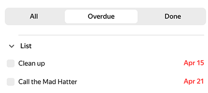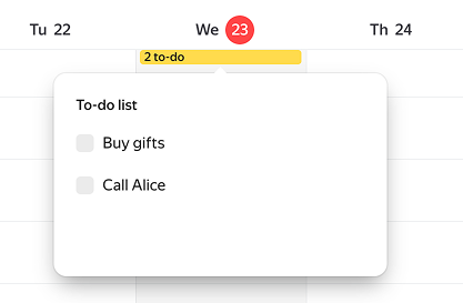 Every day at 08:00, Yandex Calendar will remind you about your upcoming to-dos. You can change what time this happens at, and also include notifications for expired to-dos: