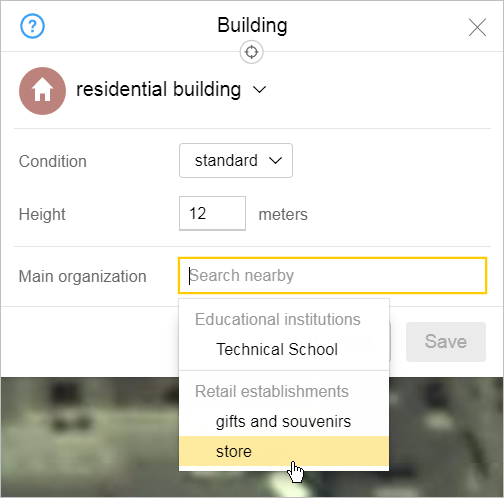 type houses several shops within: small flower and antique shops, as well as a large supermarket. In this example, the supermarket is clearly the main organization.So you choose the supermarket from a building's organization list in the Main organization field: