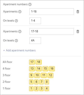 If the sequential numbering condition is not met (the sequence of apartment numbers is broken or the number of apartments is different on different floors), set several combinations of apartment number and floor ranges so that this condition is met for each range. To add a second and subsequent range combinations, click Add apartment numbers again: