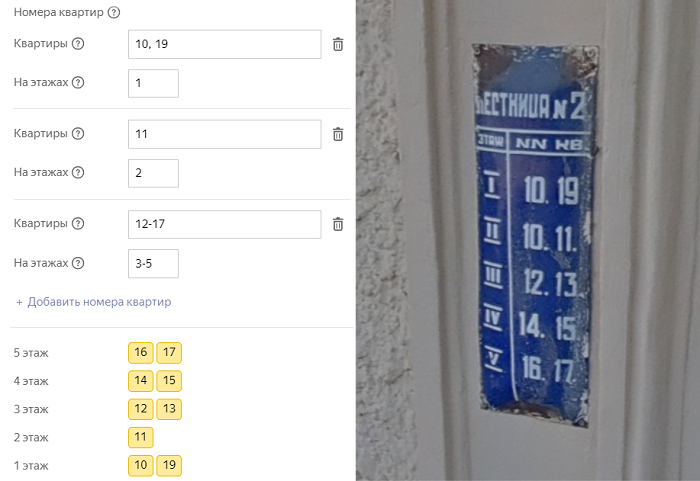 - To set the range of apartment numbers, specify the first and the last of the consecutive apartment numbers of the entrance, provided that they are numbered sequentially (without omissions) and are located on the same floor or on several floors in a row with an equal number of apartments on each floor.