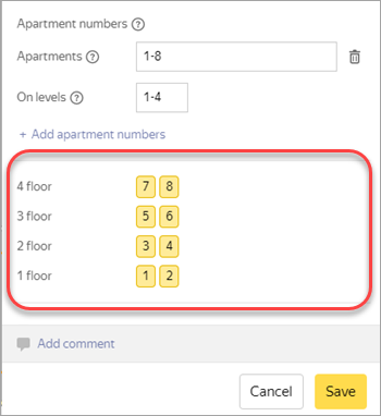 At the bottom of the Apartment numbers section, you can see how apartment numbers are assigned by floor. The apartment numbers are displayed in editing mode. This means the number ranges change in real time, and you don't have to save the item: