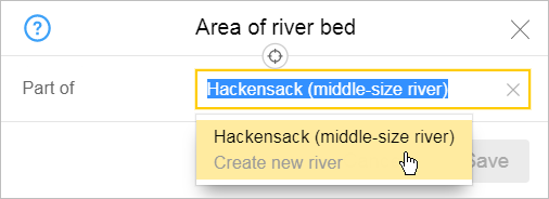attribute indicates that a section of riverbed belongs to a certain river. Specify the name of the river the section belongs to.As you start entering the name of the river into the field, a list of suggestions comprised of rivers that are already on the map will appear automatically: