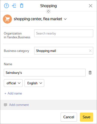 You can (but don't have to) fill out the Organization in Yandex Business field for organizations drawn outside the Indoor maps.