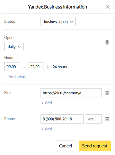 Click Send suggestion. All new or edited information will be sent to Yandex Business.