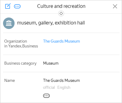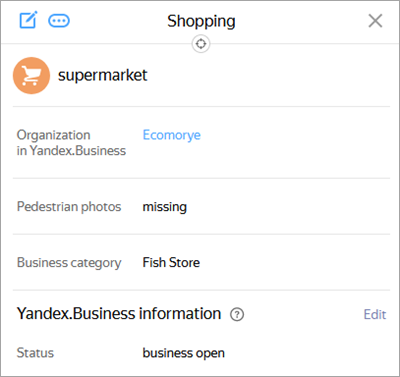 The Yandex Business business attribute connects the organization on the map to its listing in Yandex Business .
