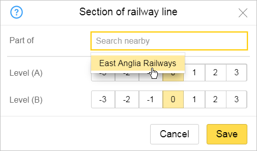 To ensure that railway lines crossing at different levels (such as when one goes through a tunnel and the other is at ground level) display correctly, enter level values in the Level Aand Level B fields to mark the start and end points of the road section: