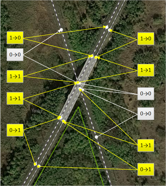 The sections of road that approach a bridge and have the values [0—1] or [1—0] for levels A and B should not be longer than the length of the bridge itself.