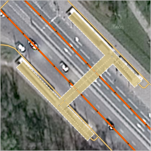 Set the bridge borders (that run perpendicular to the traffic lanes) based on the expansion joint (see also 3.8.1.1.3.3). Don't include the embankment in the polygon that represents the structure.