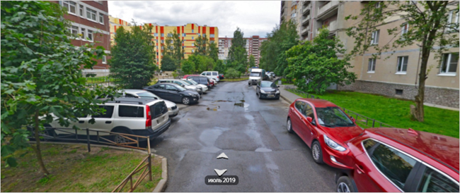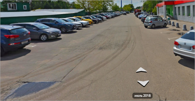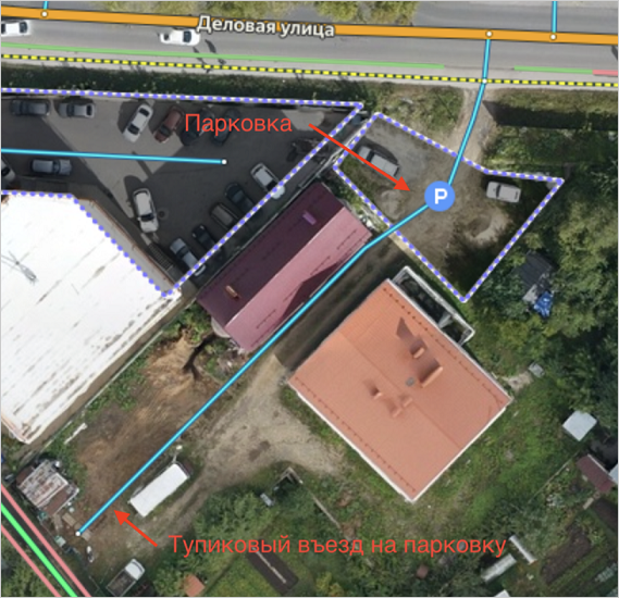 Territories that are specially designated for parking and are not roadways are designated with placemarks. Usually these are designated lots on the territories of organizations, malls, office centers, residential courtyards or between residential buildings and have entrances/exits.
