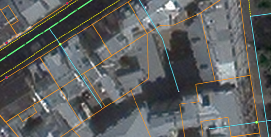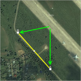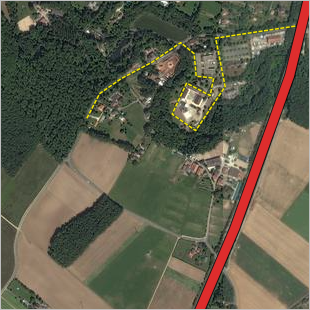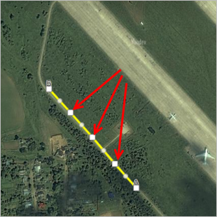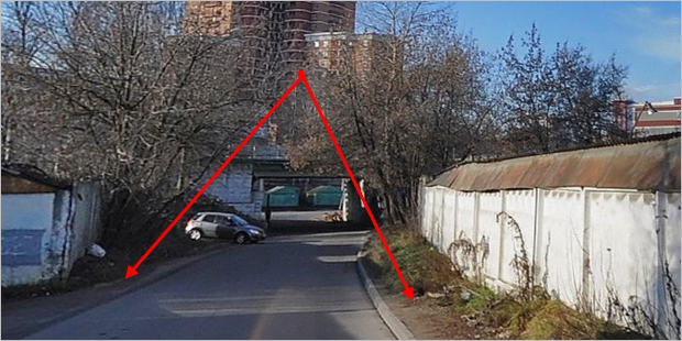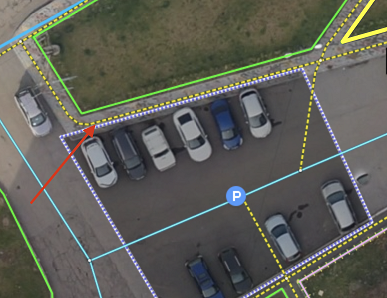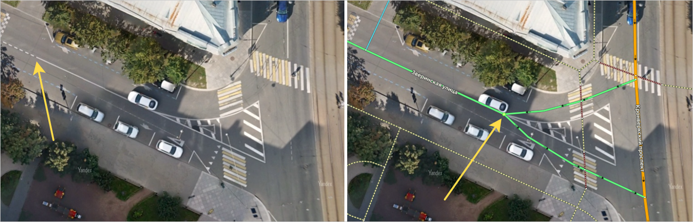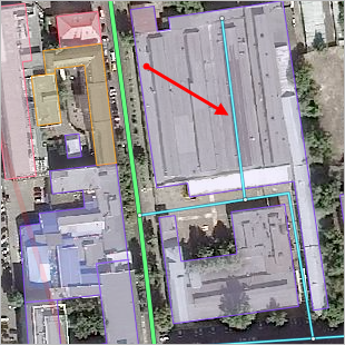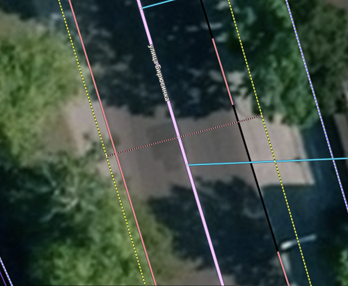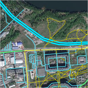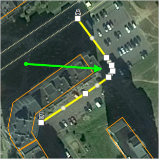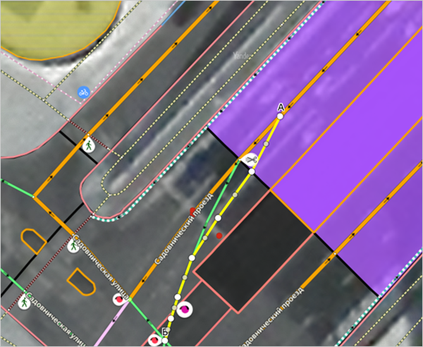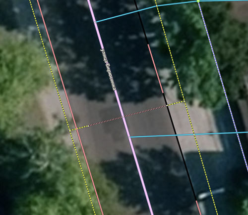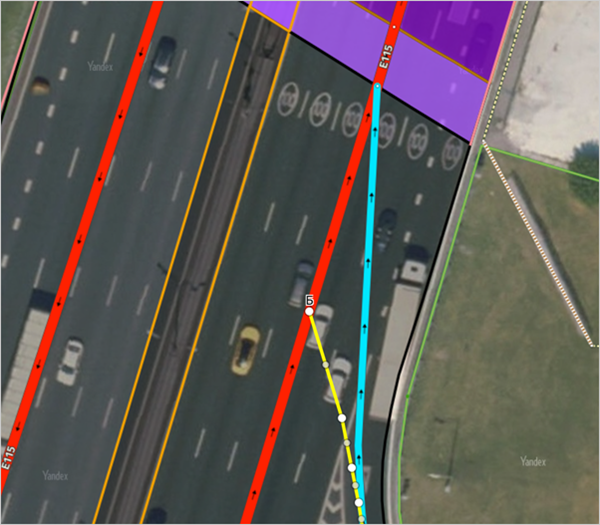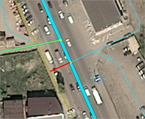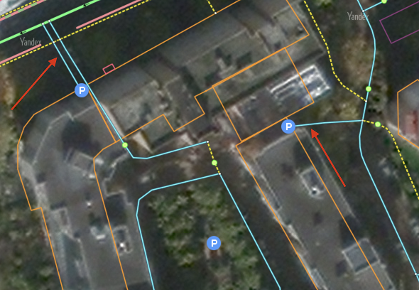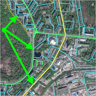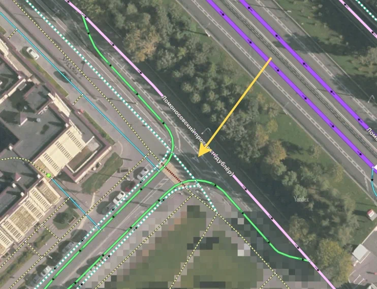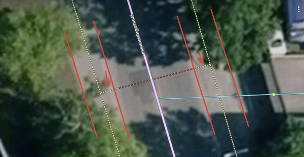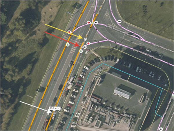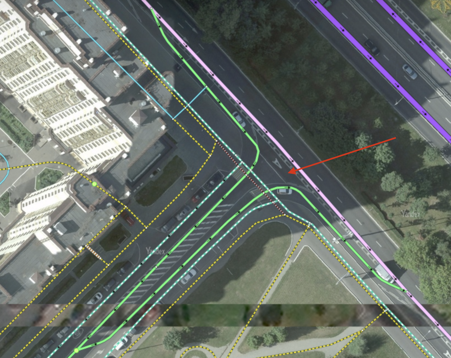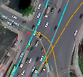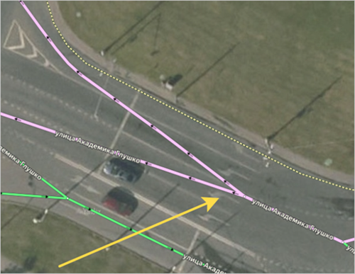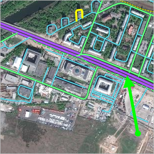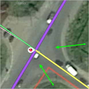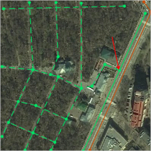 For example, the solid green line indicates a sidewalk in the drawing, the dotted line represents a network of pedestrian paths in a cemetery, and the brown line — a section of motorway. The red arrow indicates the point where they intersect. A fragment of the broader road graph is displayed on the drawing: