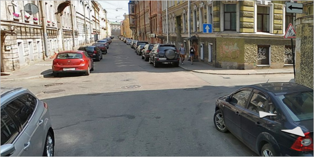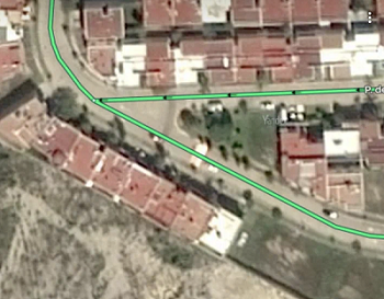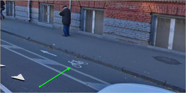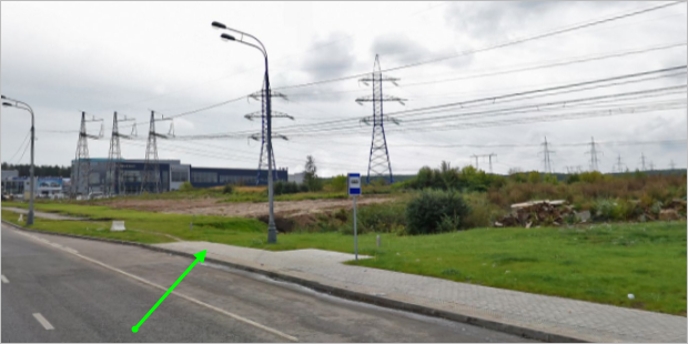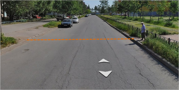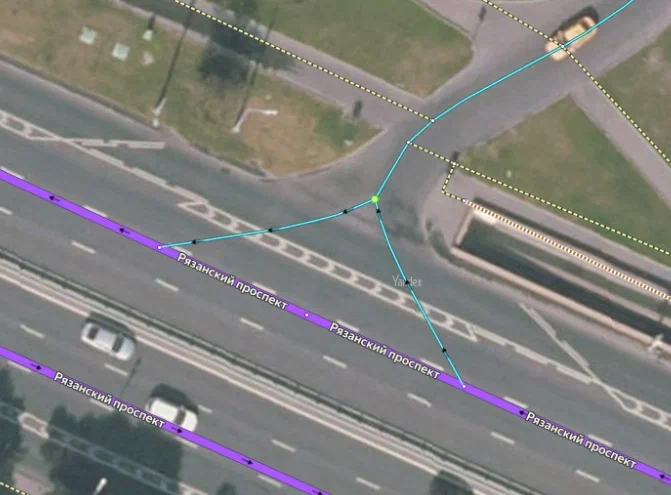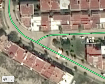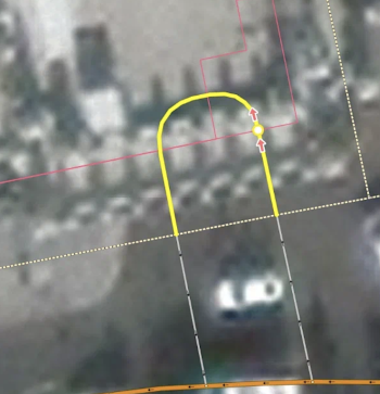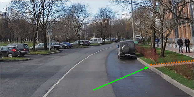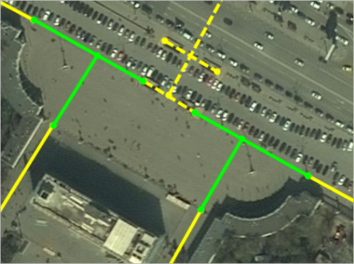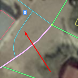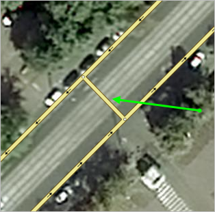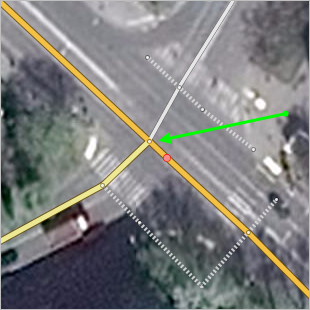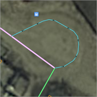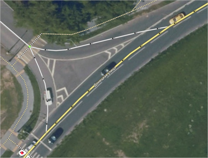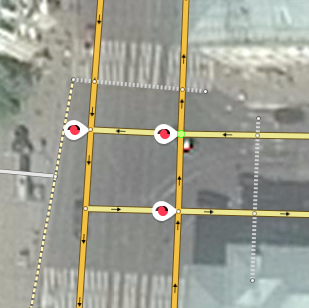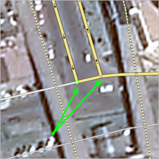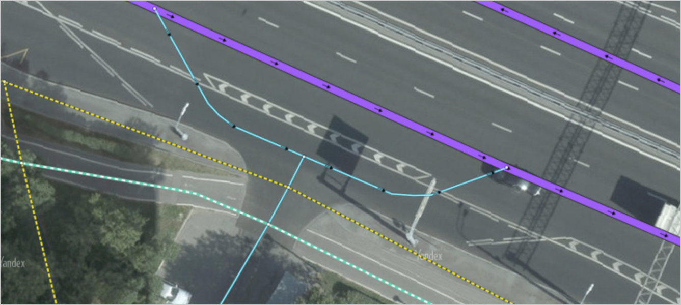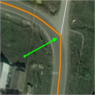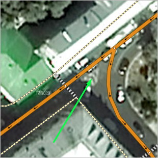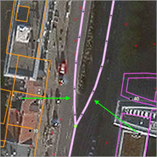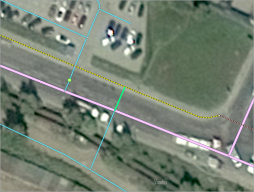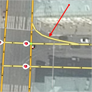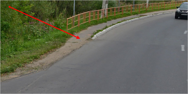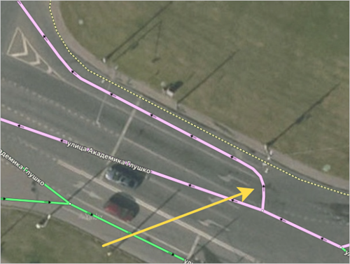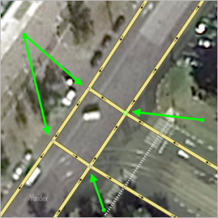 To ensure connectivity of the road network in areas where the pavement ends, but the further movement of pedestrians is possible on the side of the road, should smoothly join the line of the sidewalk and the road segment pedestrian road (in the picture the green dotted line):