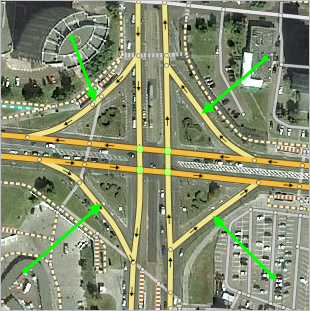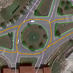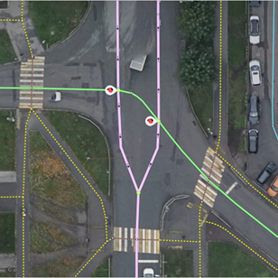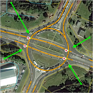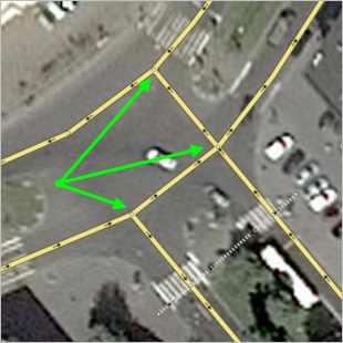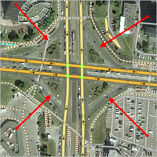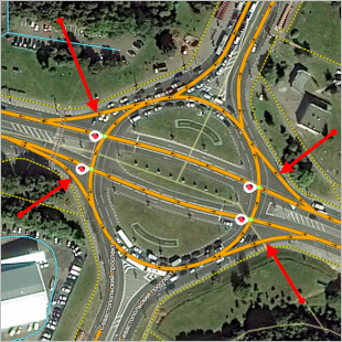 . Intersections are created automatically when you draw road sections and may be used to edit the shape of the road network (for more information, see section 2.9. Intersections) and when adding road signs, traffic lights, and speed cameras.