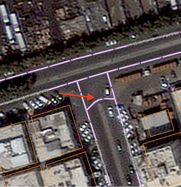 When extending roads in areas where the road network is shifted relative to the satellite image, it's preferable to align existing roads with the satellite image, but it's not required to do so. In this case, new sections should be drawn with approximately the same shift as the road network at that location.