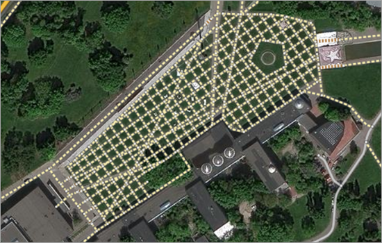 Draw class 10 paved paths located within parks and squares that form a regularly-shaped pattern. For such cases, you should fully draw the whole path network. For example: