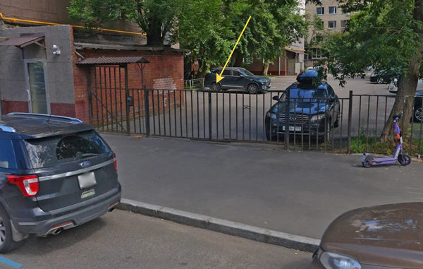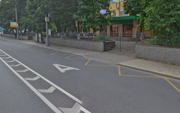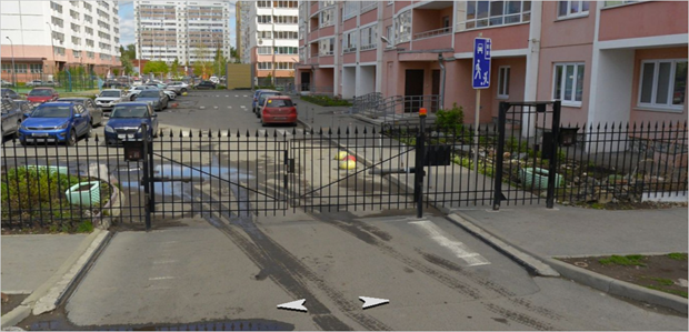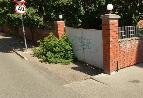 Despite the lowered curb for vehicle access, a public transport lane has appeared in the area, so passenger cars can no longer enter the courtyard at this location. The road is shown as pedestrian with "Restricted entry" at the location of the gate.