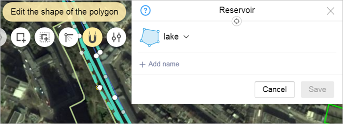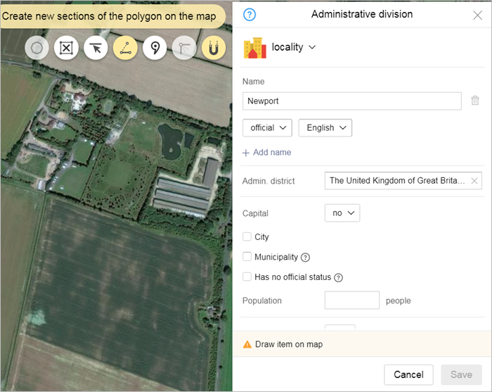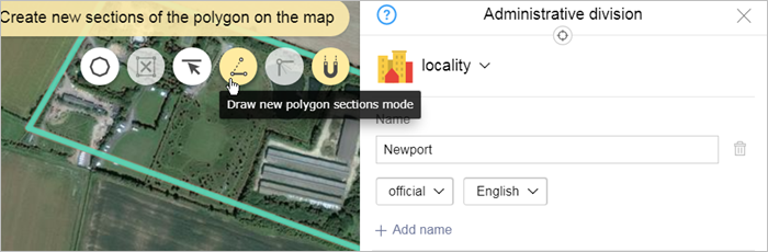 - Add new section of polygon — lets you add a new section of an outline that is part of an item. When you do this, sections that were drawn earlier are saved on the map. This feature is only used when you create items that include sections of shared border.