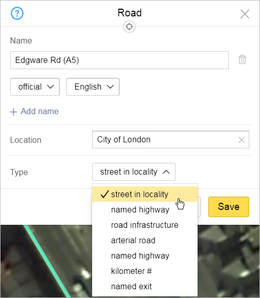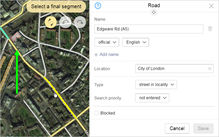 Depending on the specific item, the editing panel will include different attributes. For example, for rapid transit lines, only names can be edited; for railways — names and types. For motorways, you can edit names, types, and locations (linking the road to the administrative division where it is located):