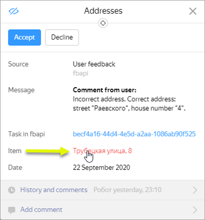 Click the selected icon. The report point will be highlighted on the map and its inaccuracy management card will open (the same goes for suggestions):