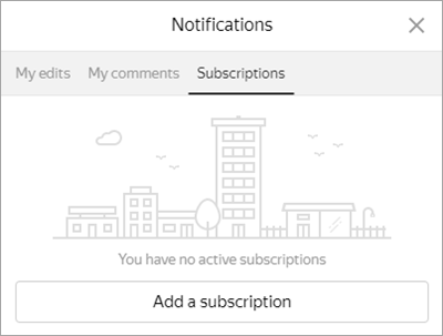 tab displays a list of your subscriptions (names of territories you've selected). You will get messages about edits in your regions.Initially, there are no subscriptions in the list.