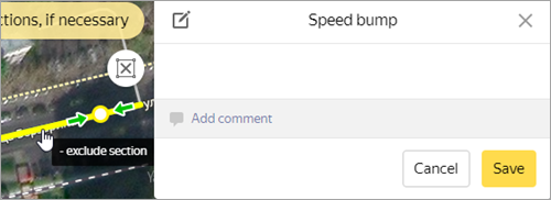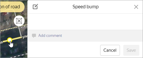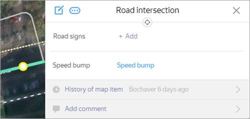 If you create an item using the Create → Speed bump option in the main menu of the Yandex Map Editor interface, the road intersection is created automatically when the desired point is selected on the map: