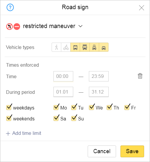If a road sign involves a few different time frames (that differ, for example, for weekdays and weekends or for different calendar periods), then click twice on Add time limit to open a second field where you can enter time restrictions along with the appropriate values.