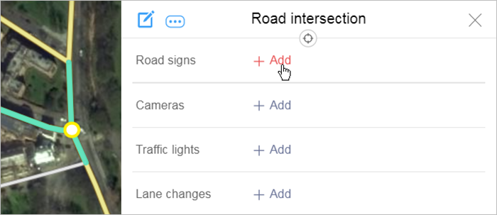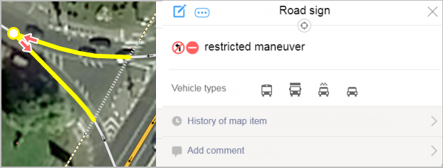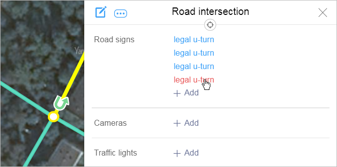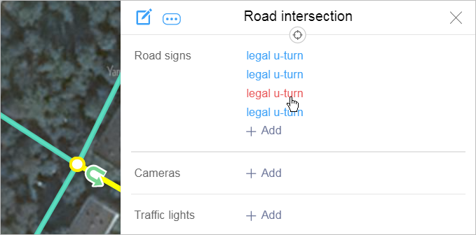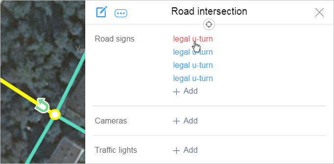 The Road sign panel will close and the Road intersection panel will open. In the Road sign section of the latter, you'll see a restricted maneuver link. If multiple maneuvers are associated with the same intersection, each of them will have its own link associated with it: