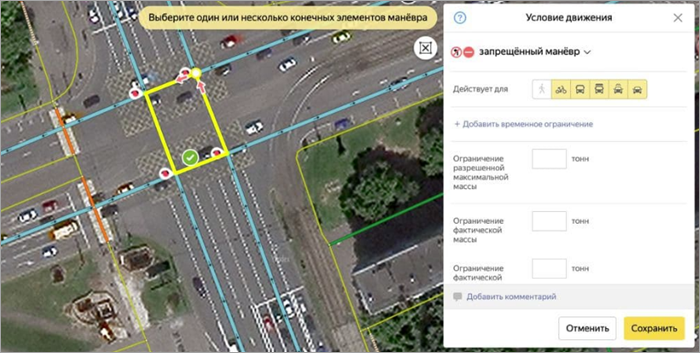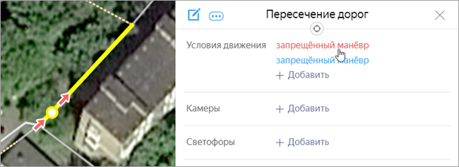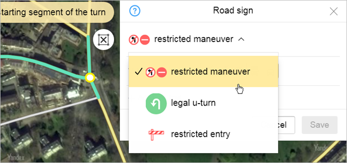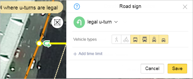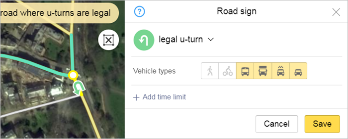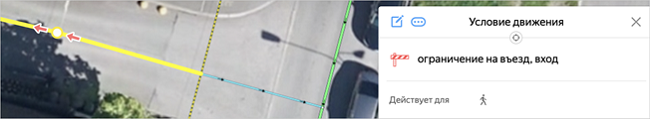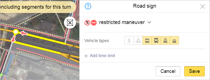 In the Applies to field, specify the types of vehicles to which the maneuver restriction applies, excluding public transport. For example, if it's not allowed to pass through the restriction on a bicycle without dismounting, then include it in the specified field.