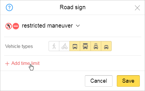 In the attribute panel that opens, click Road sign and then click Add time limit:
