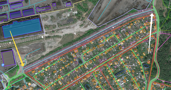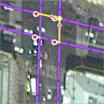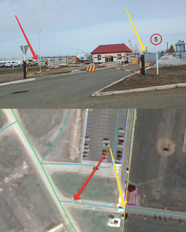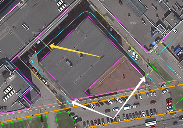 maneuvers at the locations of the barriers in both directions. Only consider class 1-8 roads when determining whether an area is restricted for motor vehicles.For example, in the picture below, there's a garage cooperative with an entrance on one side restricted by a boom gate (white arrow) and open on the other side (yellow arrow). Set two opposing
