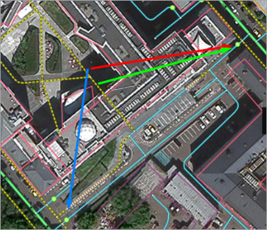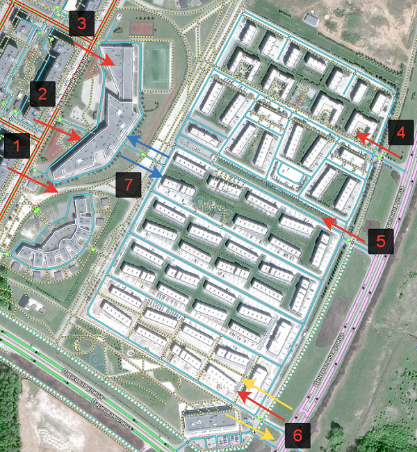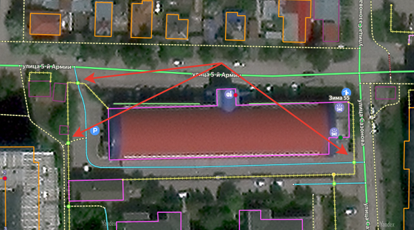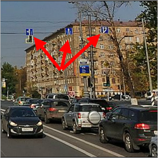 at the same intersection.For example, the blue arrow marks the guest entrance on the picture, the red arrow marks the service entrance, and the green arrow marks the location of the restricted maneuver sign (the same point where entry restrictions apply):