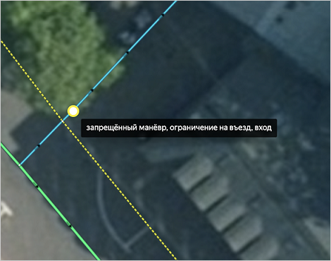 — Entrances to a road that ends up being isolated due to lane marking before the entrance, although entry to this road is actually permitted. In this case, the restriction is set at the nearest intersection before the entrance.