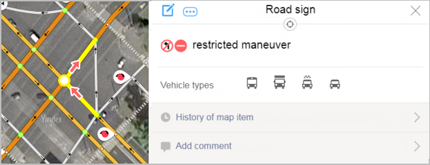 To map movement prohibitions and restrictions in various road directions at intersections, movement prohibitions and restrictions along road sections separated from the road network by obstacles (checkpoints, barriers, gates, road signs, concrete blocks, and so on), and to prevent plotting routes through restricted areas, we use special objects called Road signs