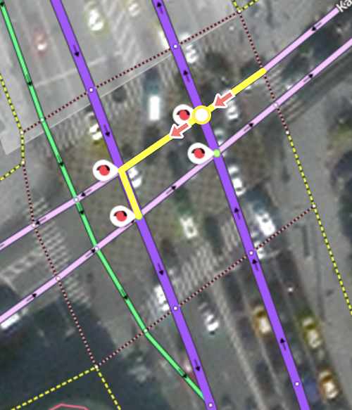 This situation is mapped by specifying the traffic (prohibition of right turn at the intersection):