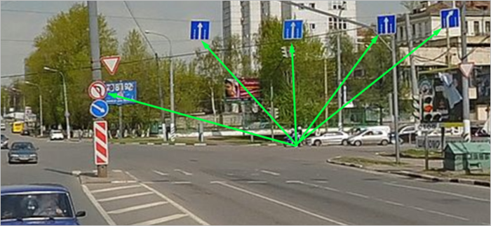 Before the intersection, prescriptive signs are set that show the required directions of movement and at the same time prohibit left turn: