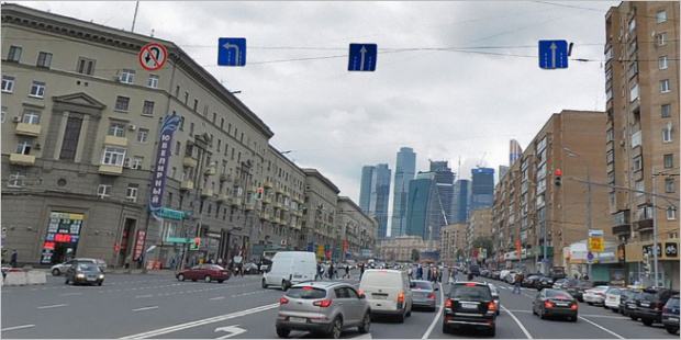 This is mapped using the following road signs (red arrows mark the area where turns/u-turns are forbidden at intersections of central roads):