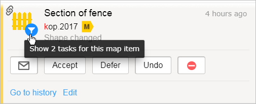If several current tasks are connected to a given map item, then a Show all tasks for this map item icon will display along with the category icon. If you click on this icon, only tasks that are connected to that item will appear in the list. At the beginning of the list, a Reset filter button will appear (with the name of the item you selected):
